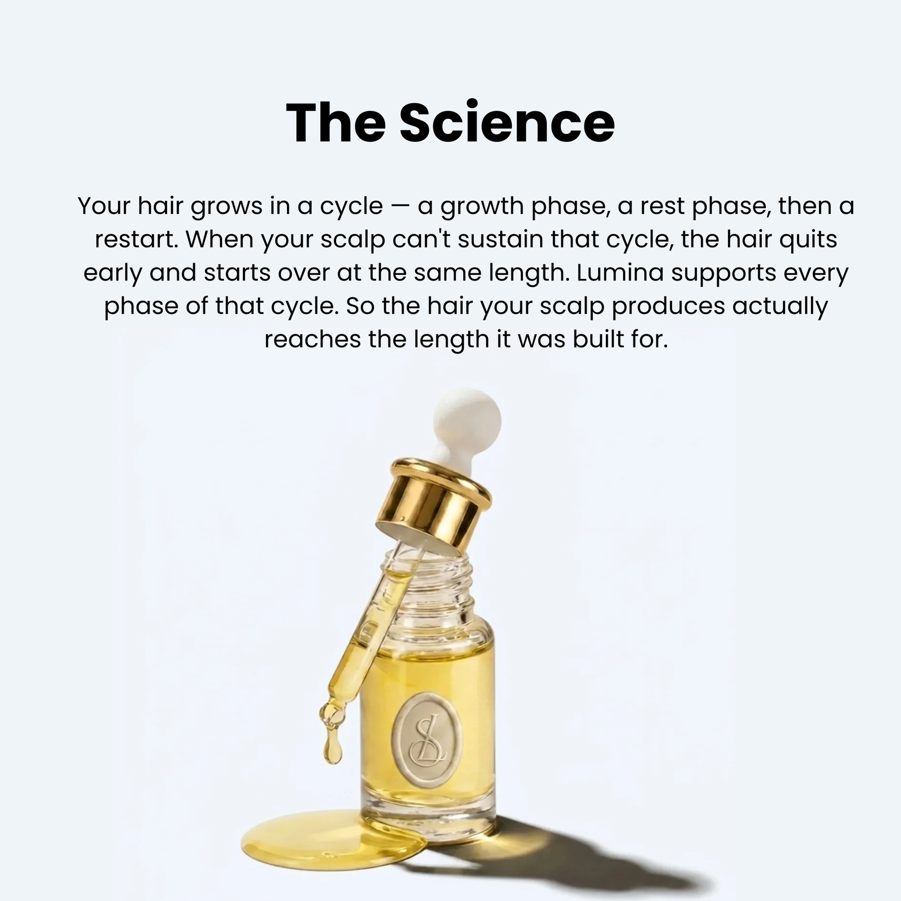 Your hair grows in a cycle. When your scalp can't support that cycle, the hair quits early and starts over at the same length, every time. Lumina is precision-dosed to support every phase of that cycle. So your hair finally gets past the length it keeps resetting at.