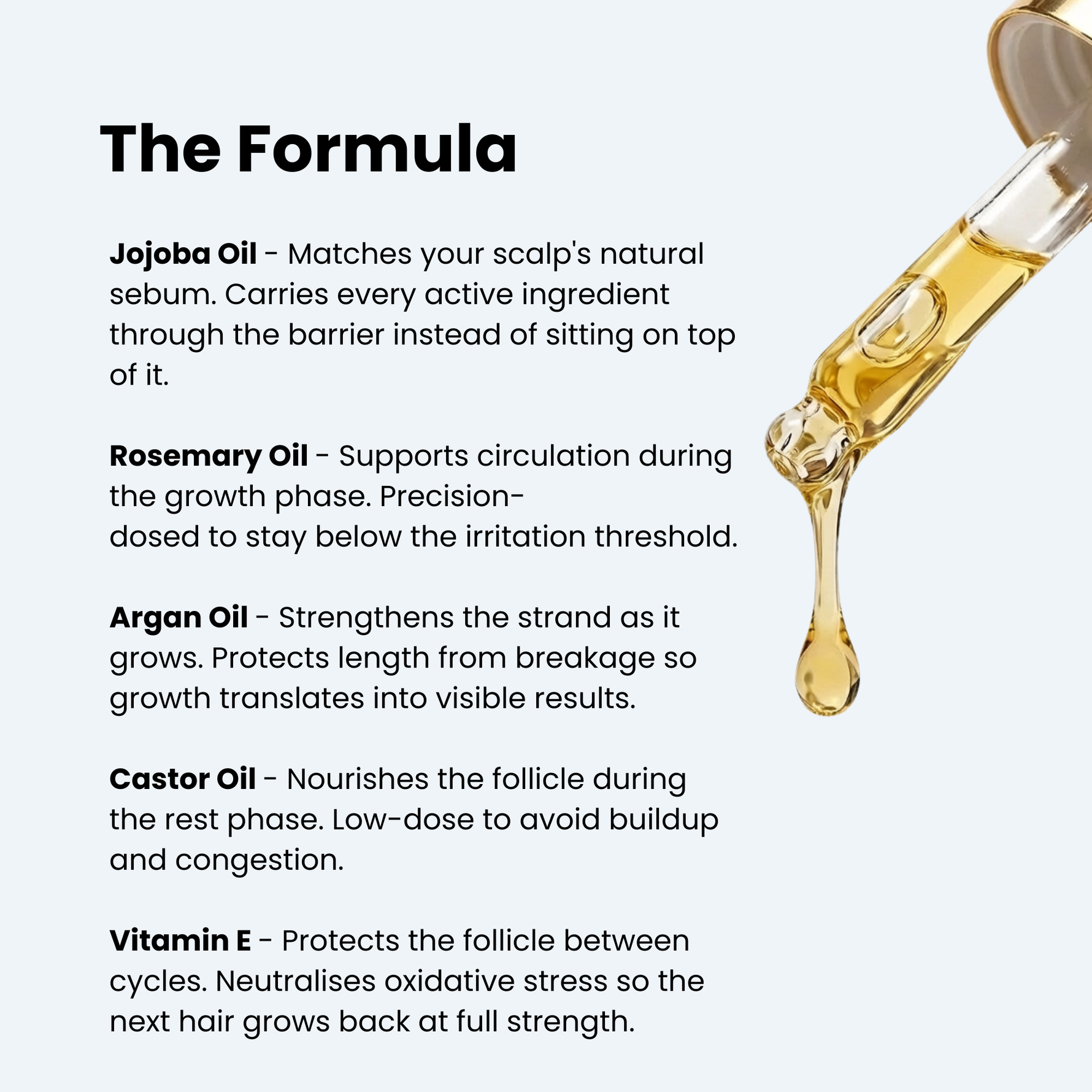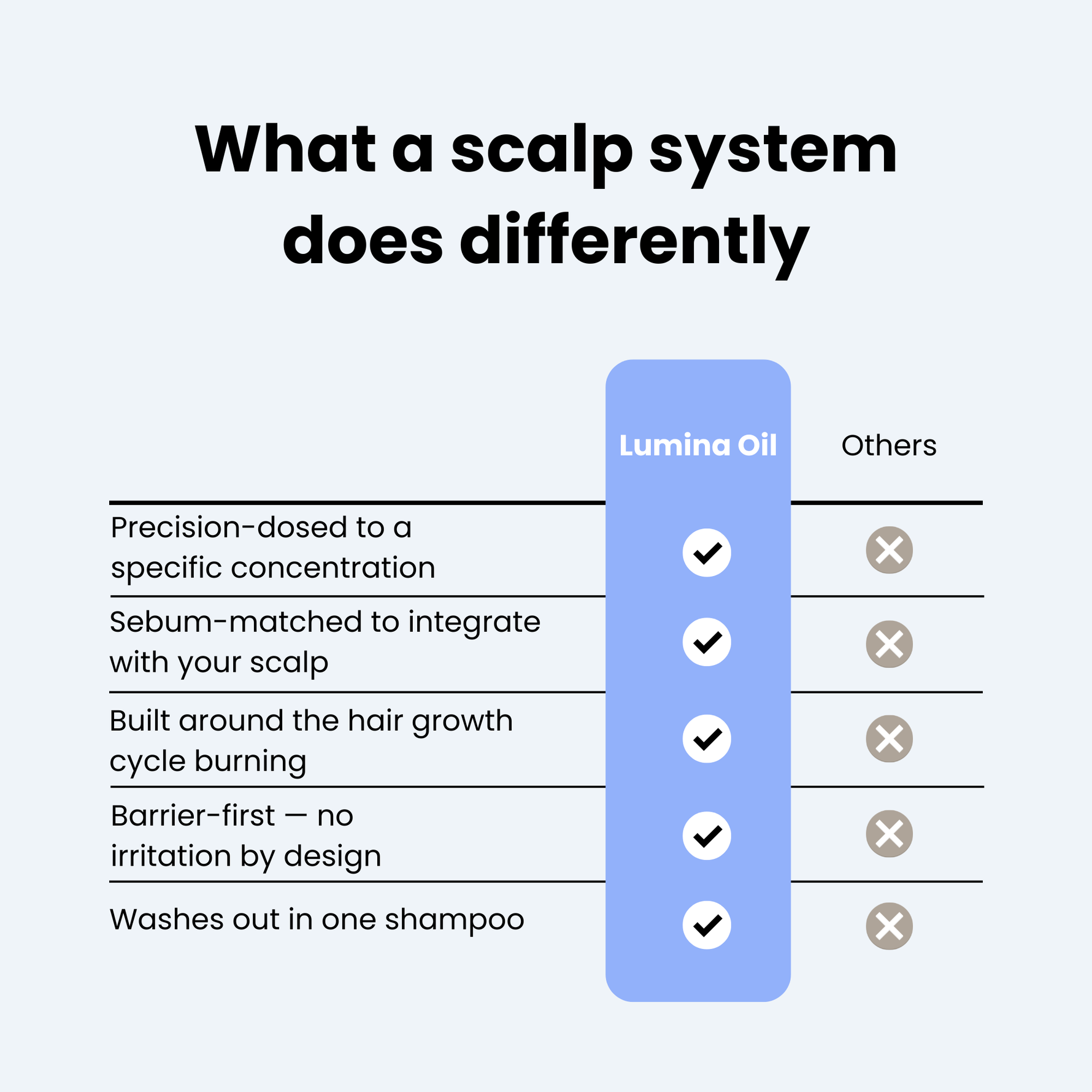 Your scalp is skin: with a barrier, a microbiome, and a growth cycle that most hair oils ignore completely. Lumina Oil is the scalp system built around that truth.